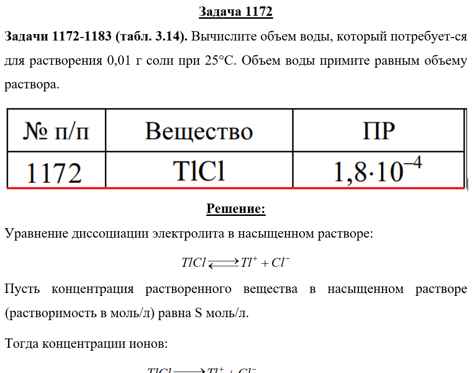 Задача 1172 - Вычислите объем воды, который потребуется для растворения 0,01 г соли при 25°С. Объем воды примите равным объему раствора.