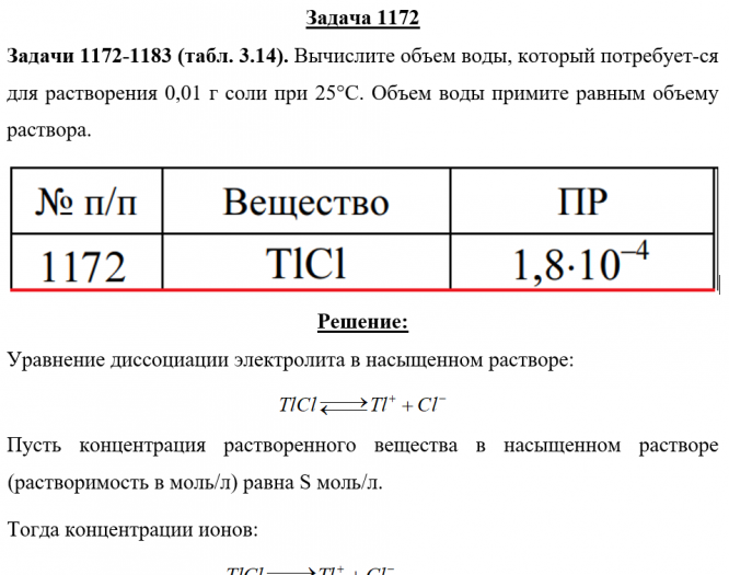 Задачи 1172-1183 (табл. 3.14). Вычислите объем воды, который потребуется для растворения 0,01 г соли при 25°С. Объем воды примите равным объему раствора..