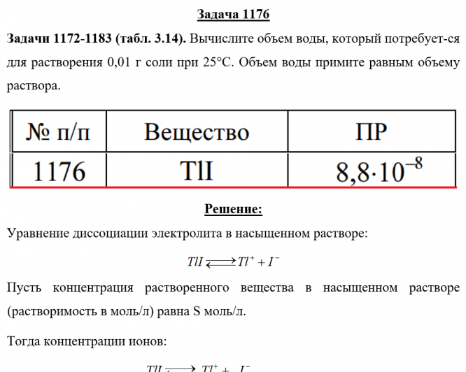 Задача 1176 - Вычислите объем воды, который потребуется для растворения 0,01 г соли при 25°С. Объем воды примите равным объему раствора.