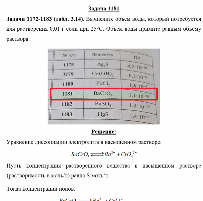 Задача 1181 - Вычислите объем воды, который потребуется для растворения 0,01 г соли при 25°С. Объем воды примите равным объему раствора.