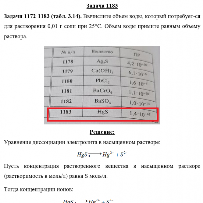 Задачи 1172-1183 (табл. 3.14). Вычислите объем воды, который потребуется для растворения 0,01 г соли при 25°С. Объем воды примите равным объему раствора..