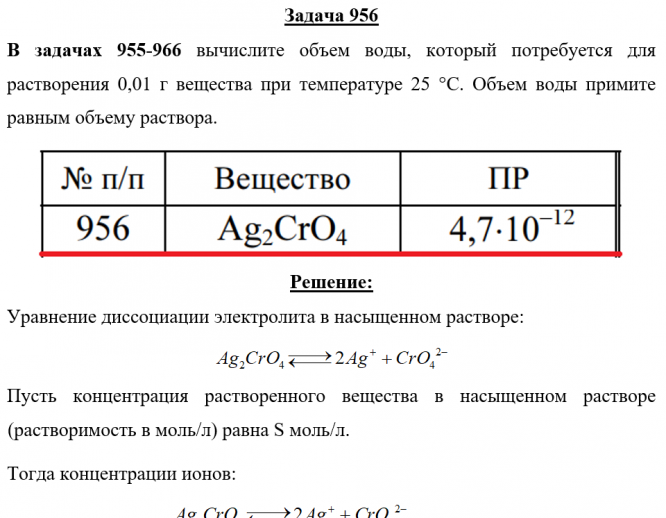 Задача 956 - вычислите объем воды, который потребуется для растворения 0,01 г вещества при температуре 25 °С. Объем воды примите равным объему раствора.