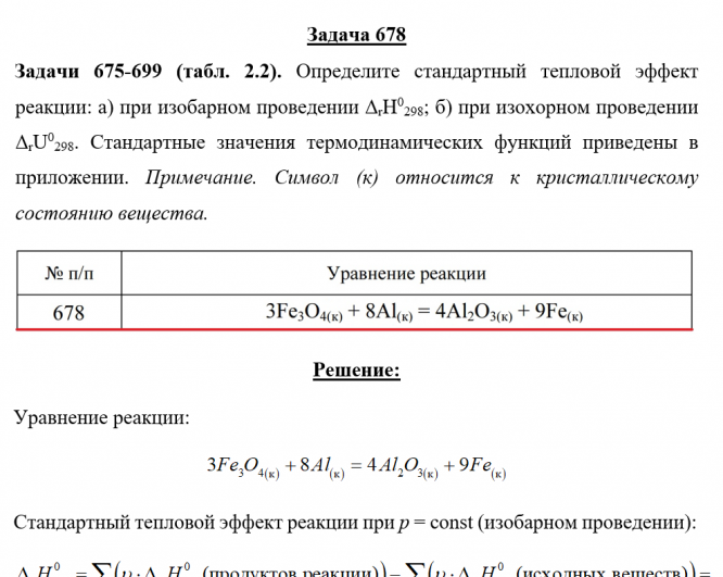 Задача 678 - Определите стандартный тепловой эффект реакции: а) при изобарном проведении ΔrH0298; б) при изохорном проведении ΔrU0298. Стандартные значения термодинамических функций приведены в приложении. Примечание. Символ (к) относится к кристалл