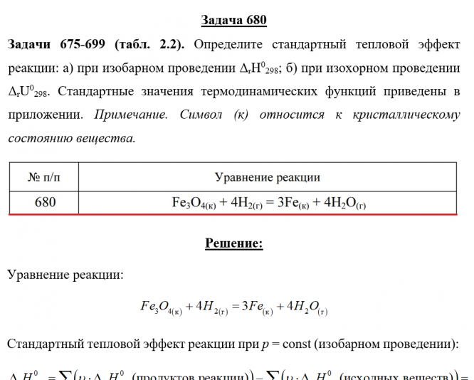 Задача 680 - Определите стандартный тепловой эффект реакции: а) при изобарном проведении ΔrH0298; б) при изохорном проведении ΔrU0298. Стандартные значения термодинамических функций приведены в приложении. Примечание. Символ (к) относится к кристалл