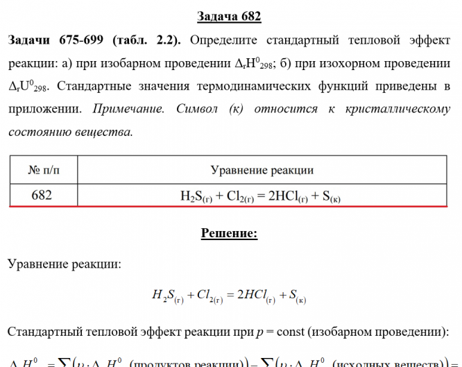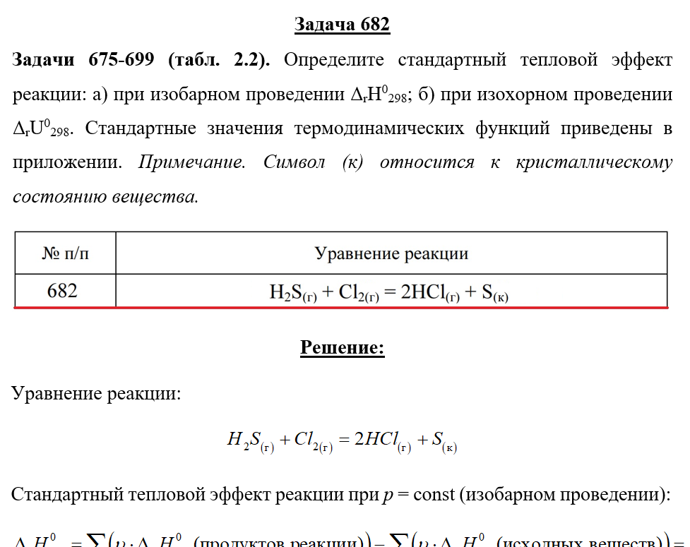 Задача 682 - Определите стандартный тепловой эффект реакции: а) при изобарном проведении ΔrH0298; б) при изохорном проведении ΔrU0298. Стандартные значения термодинамических функций приведены в приложении. Примечание. Символ (к) относится к кристалл