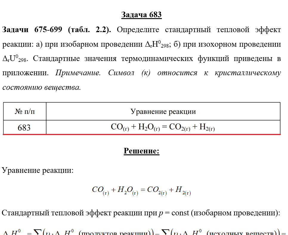 Задача 683 - Определите стандартный тепловой эффект реакции: а) при изобарном проведении ΔrH0298; б) при изохорном проведении ΔrU0298. Стандартные значения термодинамических функций приведены в приложении. Примечание. Символ (к) относится к кристалл
