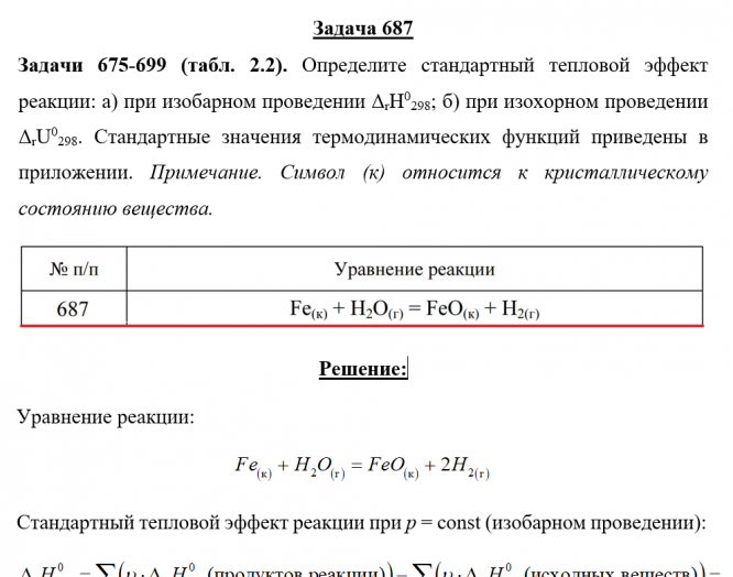 Задача 687 - Определите стандартный тепловой эффект реакции: а) при изобарном проведении ΔrH0298; б) при изохорном проведении ΔrU0298. Стандартные значения термодинамических функций приведены в приложении. Примечание. Символ (к) относится к кристалл