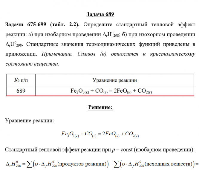 Задача 689 - Определите стандартный тепловой эффект реакции: а) при изобарном проведении ΔrH0298; б) при изохорном проведении ΔrU0298. Стандартные значения термодинамических функций приведены в приложении. Примечание. Символ (к) относится к кристалл