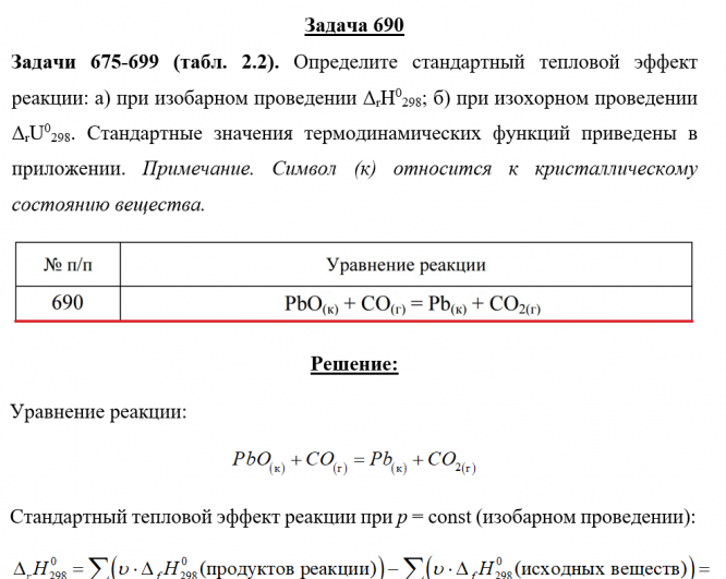 Задача 690 - Определите стандартный тепловой эффект реакции: а) при изобарном проведении ΔrH0298; б) при изохорном проведении ΔrU0298. Стандартные значения термодинамических функций приведены в приложении. Примечание. Символ (к) относится к кристалл