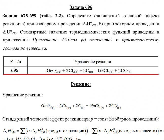 Задача 696 - Определите стандартный тепловой эффект реакции: а) при изобарном проведении ΔrH0298; б) при изохорном проведении ΔrU0298. Стандартные значения термодинамических функций приведены в приложении. Примечание. Символ (к) относится к кристалл