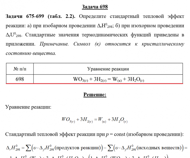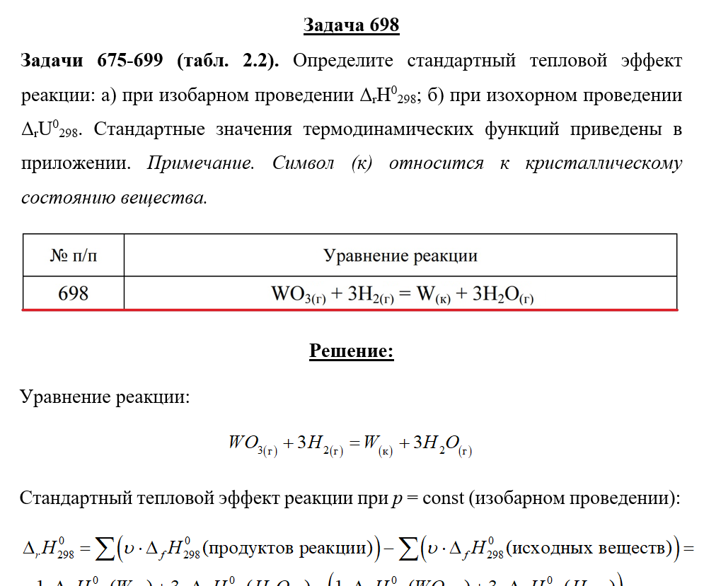 Задача 698 - Определите стандартный тепловой эффект реакции: а) при изобарном проведении ΔrH0298; б) при изохорном проведении ΔrU0298. Стандартные значения термодинамических функций приведены в приложении. Примечание. Символ (к) относится к кристалл