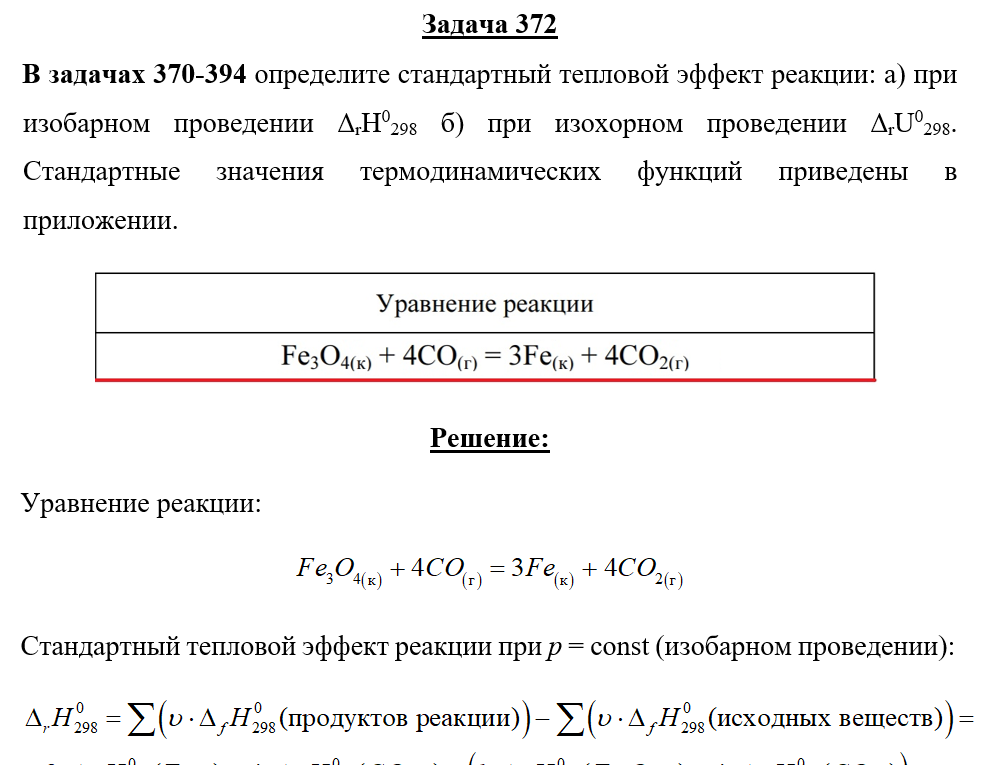 Задача 372 - определите стандартный тепловой эффект реакции: а) при изобарном проведении ΔrH0298 б) при изохорном проведении ΔrU0298. Стандартные значения термодинамических функций приведены в приложении.