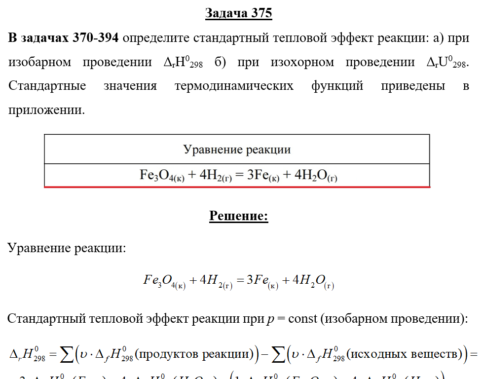 Задача 375 - определите стандартный тепловой эффект реакции: а) при изобарном проведении ΔrH0298 б) при изохорном проведении ΔrU0298. Стандартные значения термодинамических функций приведены в приложении.