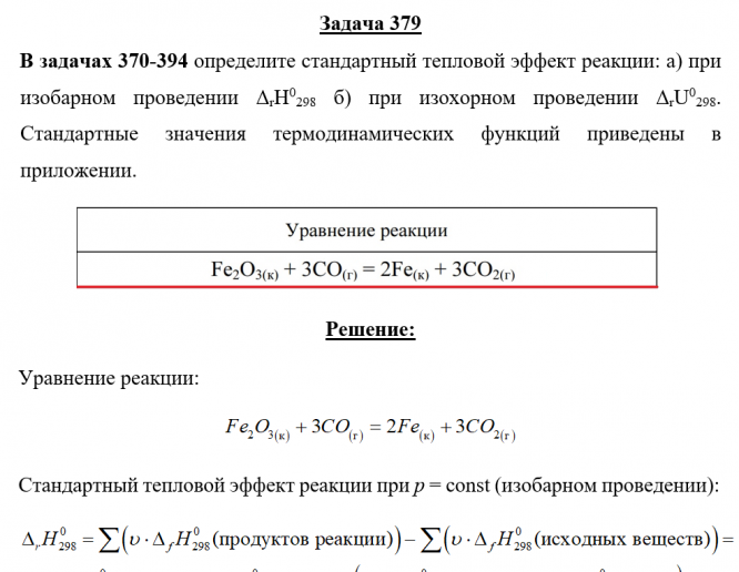 Задача 379 - определите стандартный тепловой эффект реакции: а) при изобарном проведении ΔrH0298 б) при изохорном проведении ΔrU0298. Стандартные значения термодинамических функций приведены в приложении.