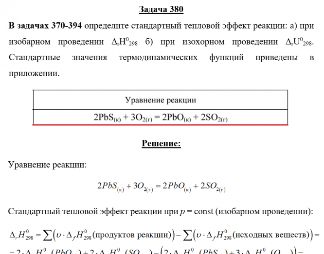 Задача 380 - определите стандартный тепловой эффект реакции: а) при изобарном проведении ΔrH0298 б) при изохорном проведении ΔrU0298. Стандартные значения термодинамических функций приведены в приложении.