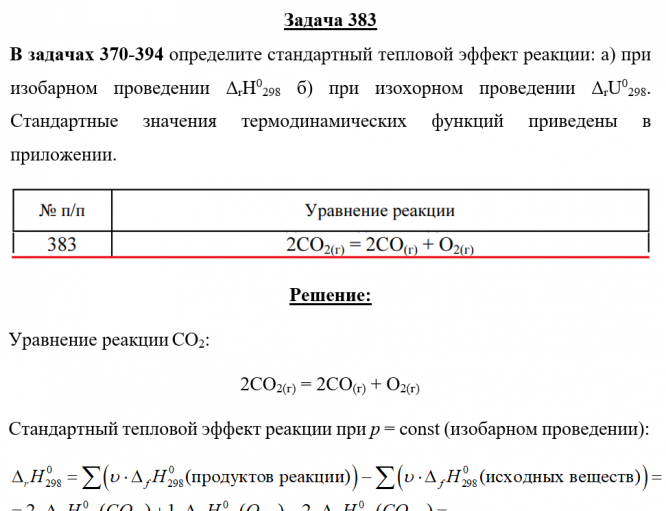 Задача 383 - определите стандартный тепловой эффект реакции: а) при изобарном проведении ΔrH0298 б) при изохорном проведении ΔrU0298. Стандартные значения термодинамических функций приведены в приложении.