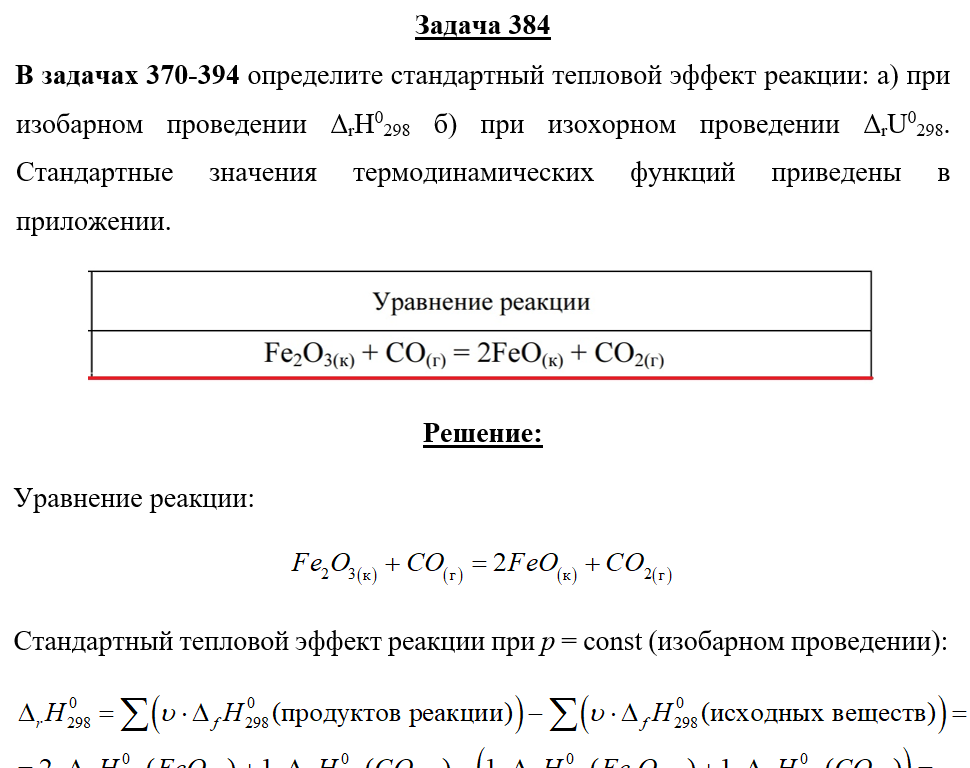Задача 384 - определите стандартный тепловой эффект реакции: а) при изобарном проведении ΔrH0298 б) при изохорном проведении ΔrU0298. Стандартные значения термодинамических функций приведены в приложении.