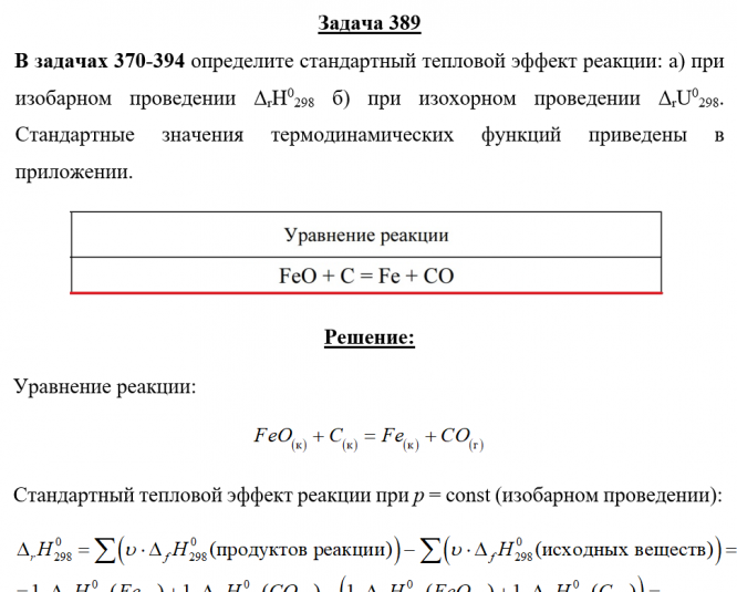 Задача 389 - определите стандартный тепловой эффект реакции: а) при изобарном проведении ΔrH0298 б) при изохорном проведении ΔrU0298. Стандартные значения термодинамических функций приведены в приложении.