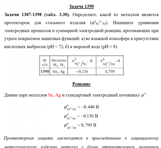 Для студентов по предмету ХимияЗадача 1390 - Определите, какой из металлов является протектором для стального изделия (φ0Fe2+/Fe). Напишите уравнения электродных процессов и суммарнЗадача 1390 - Определите, какой из металлов является протектором для стального изделия (φ0Fe2+/Fe). Напишите уравнения электродных процессов и суммарн