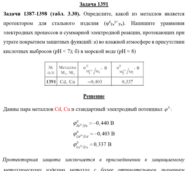 Задача 1391 - Определите, какой из металлов является протектором для стального изделия (φ0Fe2+/Fe). Напишите уравнения электродных процессов и суммарной электродной реакции, протекающих при утрате покрытием защитных функций: а) во влажной атмосфере в
