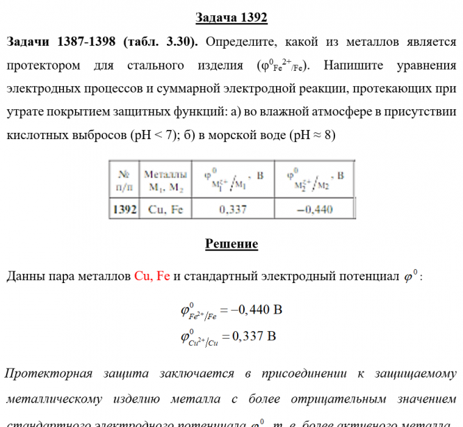Задача 1392 - Определите, какой из металлов является протектором для стального изделия (φ0Fe2+/Fe). Напишите уравнения электродных процессов и суммарной электродной реакции, протекающих при утрате покрытием защитных функций: а) во влажной атмосфере в