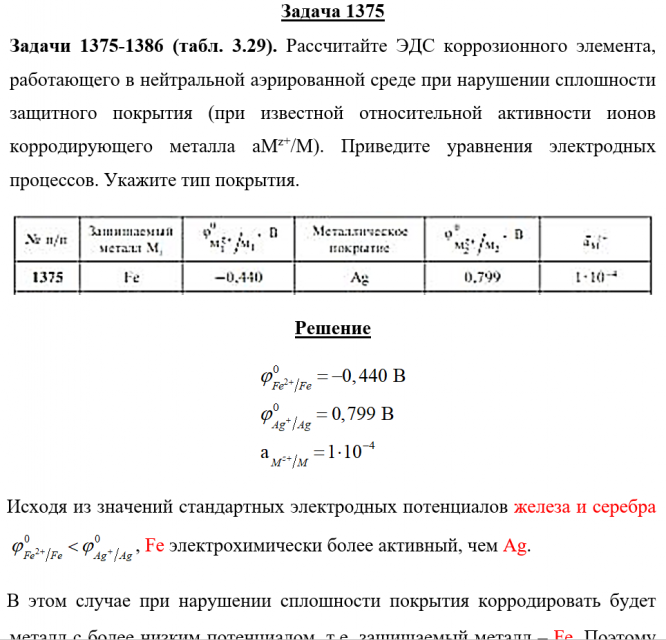 Задачи 1375-1386 (табл. 3.29). Рассчитайте ЭДС коррозионного элемента, работающего в нейтральной аэрированной среде при нарушении сплошности защитного покрытия (при известной относительной активности ионов корродирующего металла аМz+/М). Приведите уравнения электродных процессов. Укажите тип покрытия..