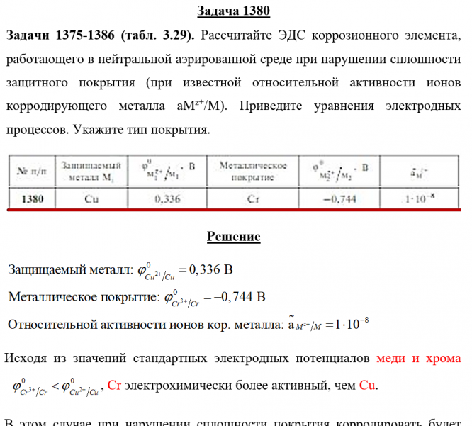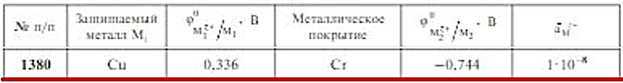Задачи 1375-1386 (табл. 3.29). Рассчитайте ЭДС коррозионного элемента, работающего в нейтральной аэрированной среде при нарушении сплошности защитного покрытия (при известной относительной активности ионов корродирующего металла аМz+/М). Приведите уравнения электродных процессов. Укажите тип покрытия.
