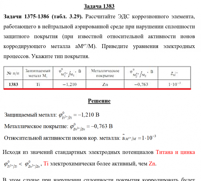 Для студентов по предмету ХимияЗадача 1383- Рассчитайте ЭДС коррозионного элемента, работающего в нейтральной аэрированной среде при нарушении сплошности защитного покрытия (при извЗадача 1383- Рассчитайте ЭДС коррозионного элемента, работающего в нейтральной аэрированной среде при нарушении сплошности защитного покрытия (при изв
