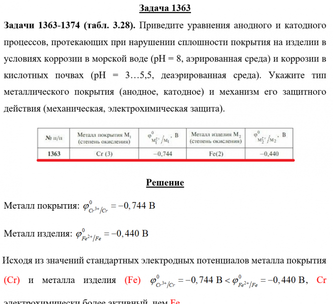 Задача 1363 - Приведите уравнения анодного и катодного процессов, протекающих при нарушении сплошности покрытия на изделии в условиях коррозии в морской воде (рН = 8, аэрированная среда) и коррозии в кислотных почвах (рН = 3…5,5, деаэрированная среда