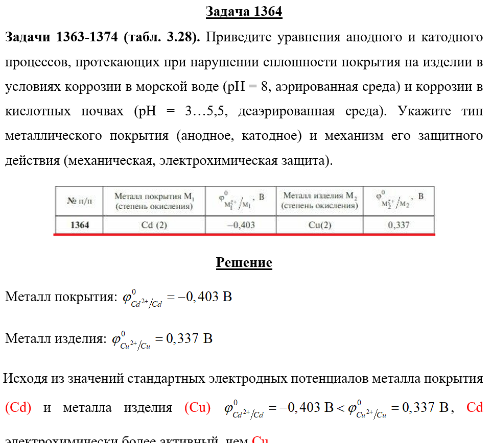 Задачи 1363-1374 (табл. 3.28). Приведите уравнения анодного и катодного процессов, протекающих при нарушении сплошности покрытия на изделии в условиях коррозии в морской воде (рН = 8, аэрированная среда) и коррозии в кислотных почвах (рН = 3…5,5, деаэрированная среда). Укажите тип металлического покрытия (анодное, катодное) и механизм его защитного действия (механическая, электрохимическая защита). ![]()
