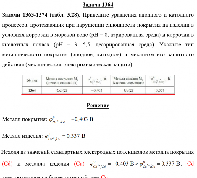 Задача 1364 - Приведите уравнения анодного и катодного процессов, протекающих при нарушении сплошности покрытия на изделии в условиях коррозии в морской воде (рН = 8, аэрированная среда) и коррозии в кислотных почвах (рН = 3…5,5, деаэрированная среда