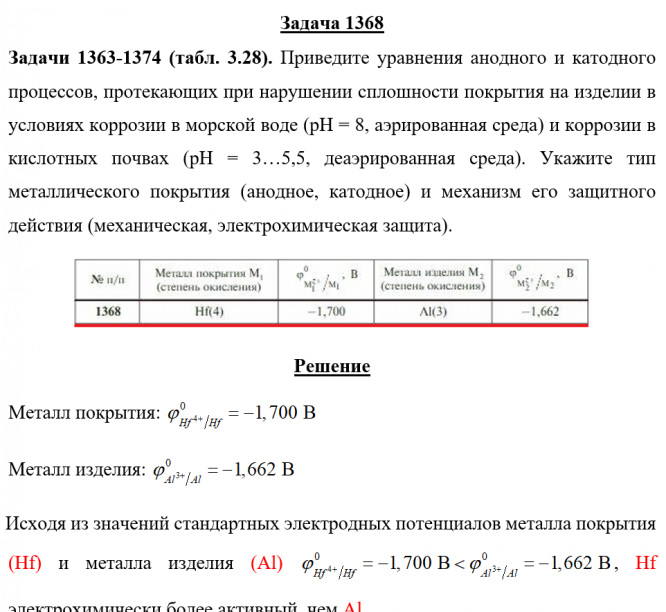 Задача 1368 - Приведите уравнения анодного и катодного процессов, протекающих при нарушении сплошности покрытия на изделии в условиях коррозии в морской воде (рН = 8, аэрированная среда) и коррозии в кислотных почвах (рН = 3…5,5, деаэрированная среда