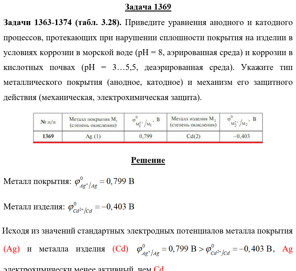 Задача 1369 - Приведите уравнения анодного и катодного процессов, протекающих при нарушении сплошности покрытия на изделии в условиях коррозии в морской воде (рН = 8, аэрированная среда) и коррозии в кислотных почвах (рН = 3…5,5, деаэрированная среда