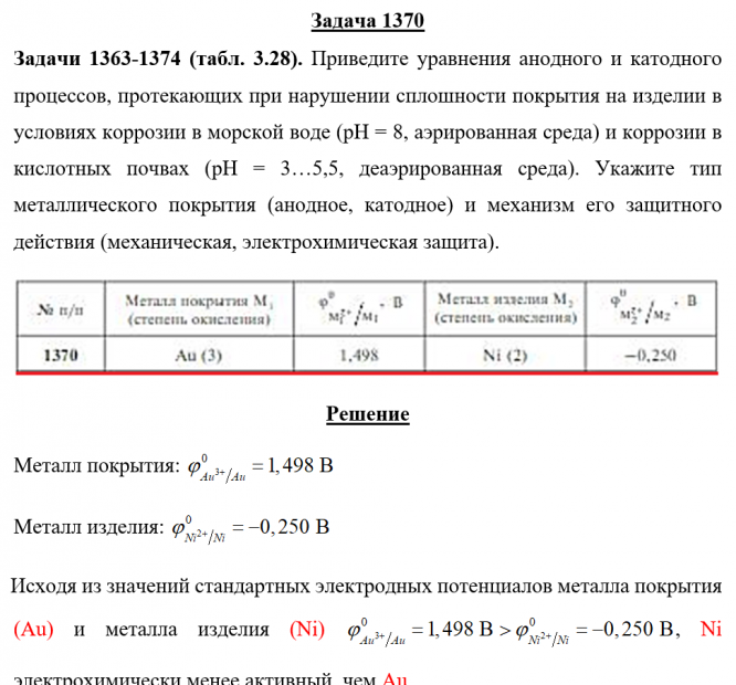 Задача 1370 - Приведите уравнения анодного и катодного процессов, протекающих при нарушении сплошности покрытия на изделии в условиях коррозии в морской воде (рН = 8, аэрированная среда) и коррозии в кислотных почвах (рН = 3…5,5, деаэрированная среда