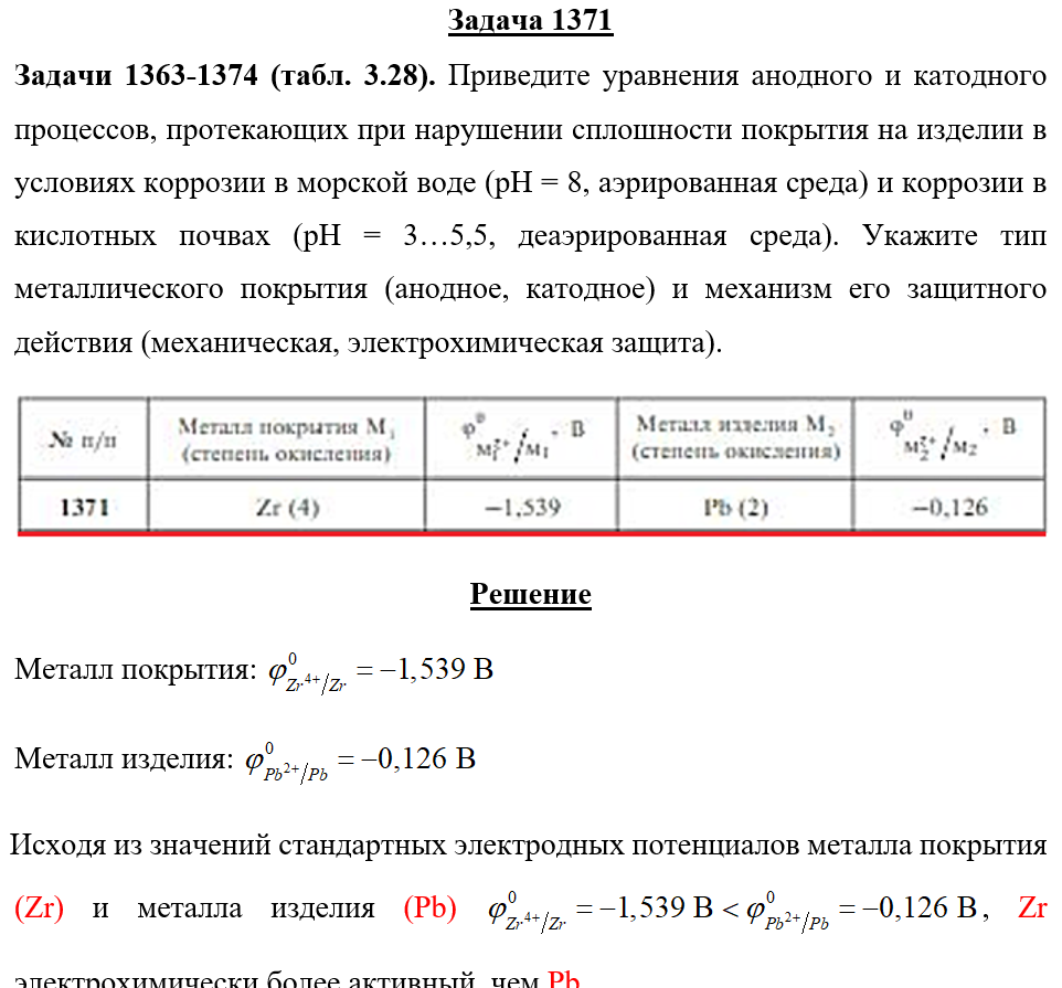 Задача 1371 - Приведите уравнения анодного и катодного процессов, протекающих при нарушении сплошности покрытия на изделии в условиях коррозии в морской воде (рН = 8, аэрированная среда) и коррозии в кислотных почвах (рН = 3…5,5, деаэрированная среда