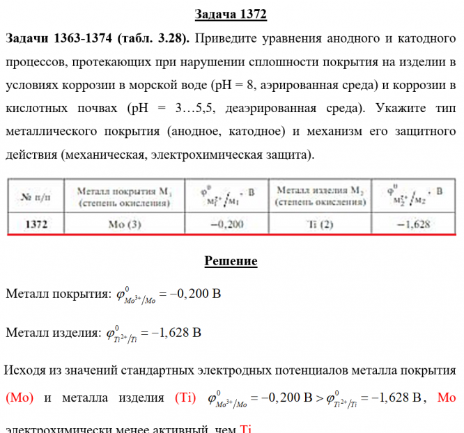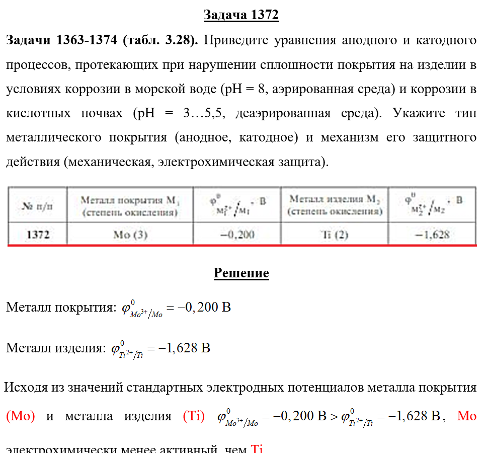 Задача 1372 - Приведите уравнения анодного и катодного процессов, протекающих при нарушении сплошности покрытия на изделии в условиях коррозии в морской воде (рН = 8, аэрированная среда) и коррозии в кислотных почвах (рН = 3…5,5, деаэрированная среда