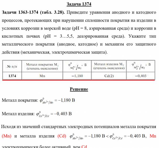 Задача 1374 - Приведите уравнения анодного и катодного процессов, протекающих при нарушении сплошности покрытия на изделии в условиях коррозии в морской воде (рН = 8, аэрированная среда) и коррозии в кислотных почвах (рН = 3…5,5, деаэрированная среда