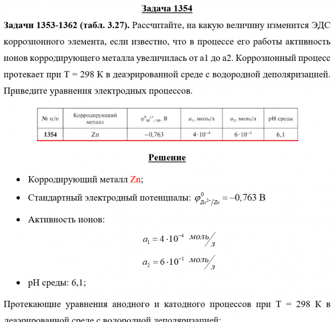 Задачи 1353-1362 (табл. 3.27). Рассчитайте, на какую величину изменится ЭДС коррозионного элемента, если известно, что в процессе его работы активность ионов корродирующего металла увеличилась от а1 до а2. Коррозионный процесс протекает при Т = 298 К в деаэрированной среде с водородной деполяризацией. Приведите уравнения электродных процессов..
