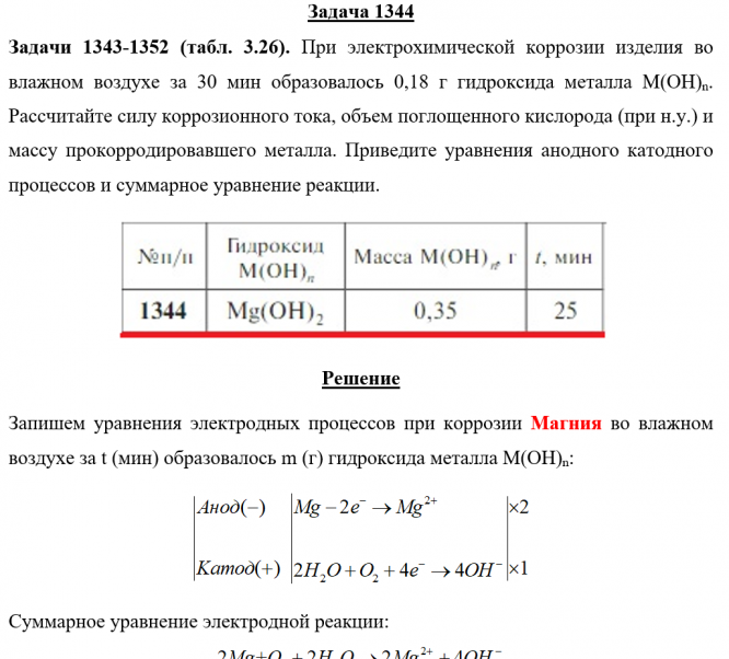 Задачи 1343-1352 (табл. 3.26). При электрохимической коррозии изделия во влажном воздухе за 30 мин образовалось 0,18 г гидроксида металла М(ОН)n. Рассчитайте силу коррозионного тока, объем поглощенного кислорода (при н.у.) и массу прокорродировавшего металла. Приведите уравнения анодного катодного процессов и суммарное уравнение реакции.