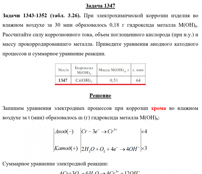 Задачи 1343-1352 (табл. 3.26). При электрохимической коррозии изделия во влажном воздухе за 30 мин образовалось 0,18 г гидроксида металла М(ОН)n. Рассчитайте силу коррозионного тока, объем поглощенного кислорода (при н.у.) и массу прокорродировавшего металла. Приведите уравнения анодного катодного процессов и суммарное уравнение реакции..