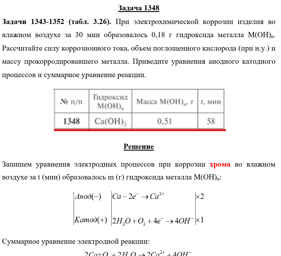 Задачи 1343-1352 (табл. 3.26). При электрохимической коррозии изделия во влажном воздухе за 30 мин образовалось 0,18 г гидроксида металла М(ОН)n. Рассчитайте силу коррозионного тока, объем поглощенного кислорода (при н.у.) и массу прокорродировавшего металла. Приведите уравнения анодного катодного процессов и суммарное уравнение реакции.