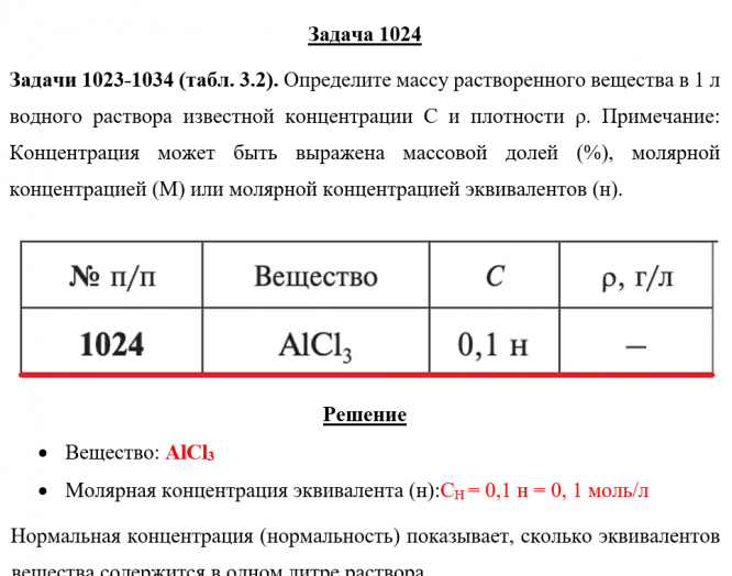 Задачи 1023-1034 (табл. 3.2). Определите массу растворенного вещества в 1 л водного раствора известной концентрации С и плотности ρ.Примечание. Концентрация может быть выражена массовой долей (%), молярной концентрацией (М) или молярной концентрацией эквивалентов (н).
