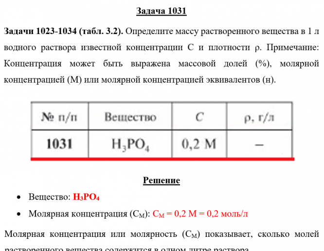 Задачи 1023-1034 (табл. 3.2). Определите массу растворенного вещества в 1 л водного раствора известной концентрации С и плотности ρ.Примечание. Концентрация может быть выражена массовой долей (%), молярной концентрацией (М) или молярной концентрацией эквивалентов (н)..