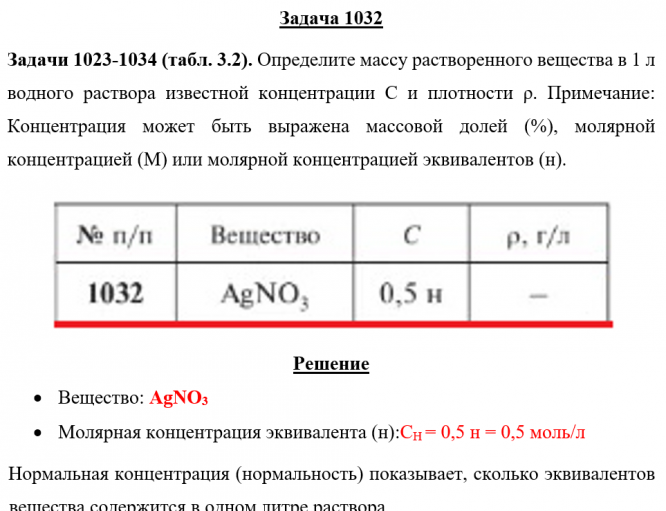 Задачи 1023-1034 (табл. 3.2). Определите массу растворенного вещества в 1 л водного раствора известной концентрации С и плотности ρ.Примечание. Концентрация может быть выражена массовой долей (%), молярной концентрацией (М) или молярной концентрацией эквивалентов (н)..