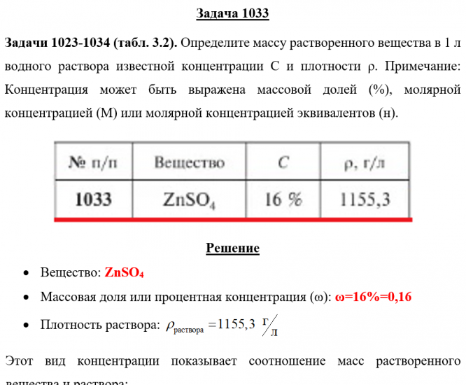 Задача 1033 - Определите массу растворенного вещества в 1 л водного раствора известной концентрации С и плотности ρ.Примечание. Концентрация может быть выражена массовой долей (%), молярной концентрацией (М) или молярной концентрацией эквивалентов (н