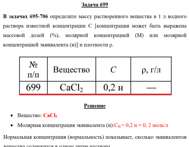 Задача 699 - определите массу растворенного вещества в 1 л водного раствора известной концентрации С [концентрация может быть выражена массовой долей (%), молярной концентрацией (М) или молярной концентрацией эквивалента (н)] и плотности ρ.