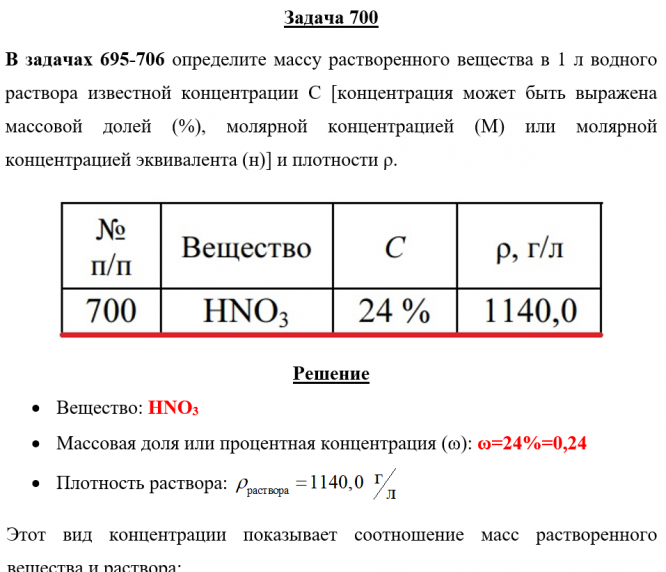 Задача 700 - определите массу растворенного вещества в 1 л водного раствора известной концентрации С [концентрация может быть выражена массовой долей (%), молярной концентрацией (М) или молярной концентрацией эквивалента (н)] и плотности ρ.