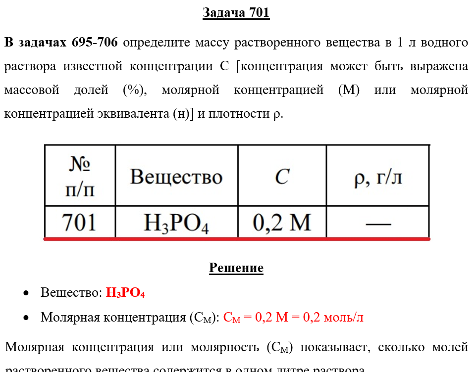 Задача 701 - определите массу растворенного вещества в 1 л водного раствора известной концентрации С [концентрация может быть выражена массовой долей (%), молярной концентрацией (М) или молярной концентрацией эквивалента (н)] и плотности ρ.