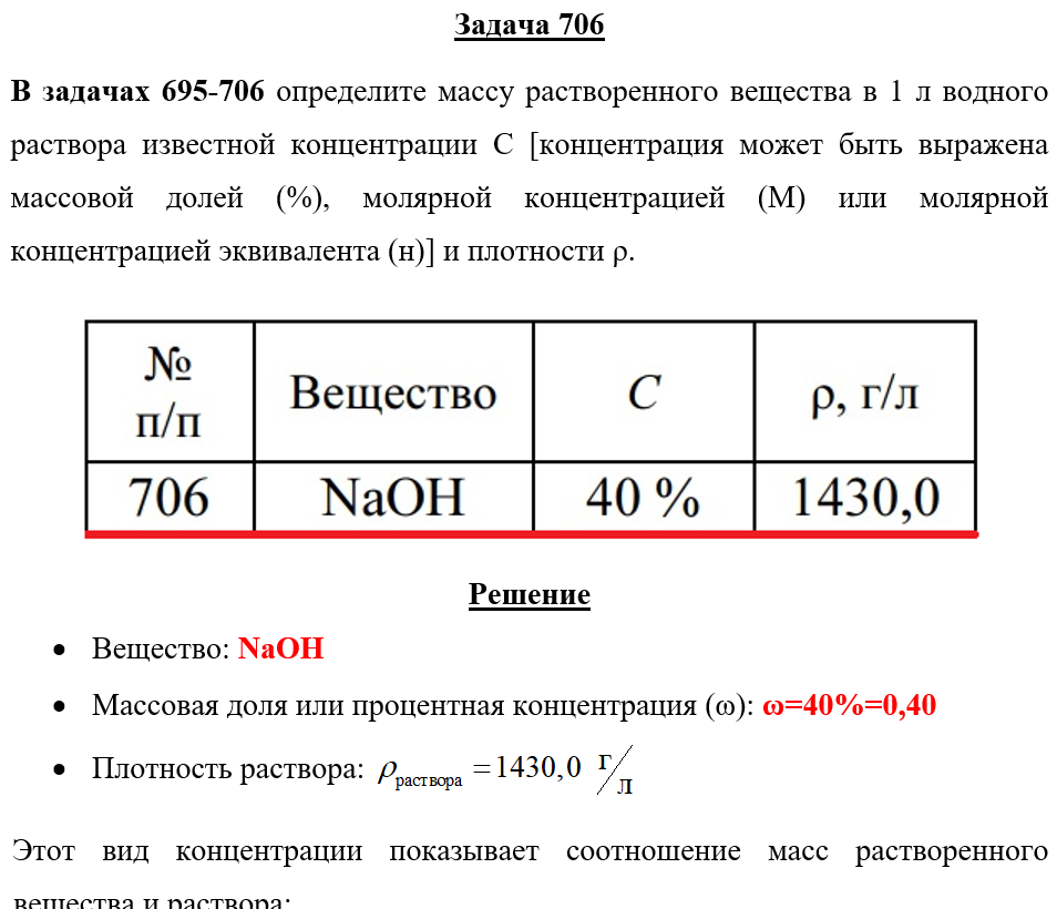Задача 706 - определите массу растворенного вещества в 1 л водного раствора известной концентрации С [концентрация может быть выражена массовой долей (%), молярной концентрацией (М) или молярной концентрацией эквивалента (н)] и плотности ρ.