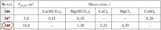 Задача 348: Рассчитайте значения временной, постоянной и общей жесткости по известной массе солей, растворенных в объеме воды V.